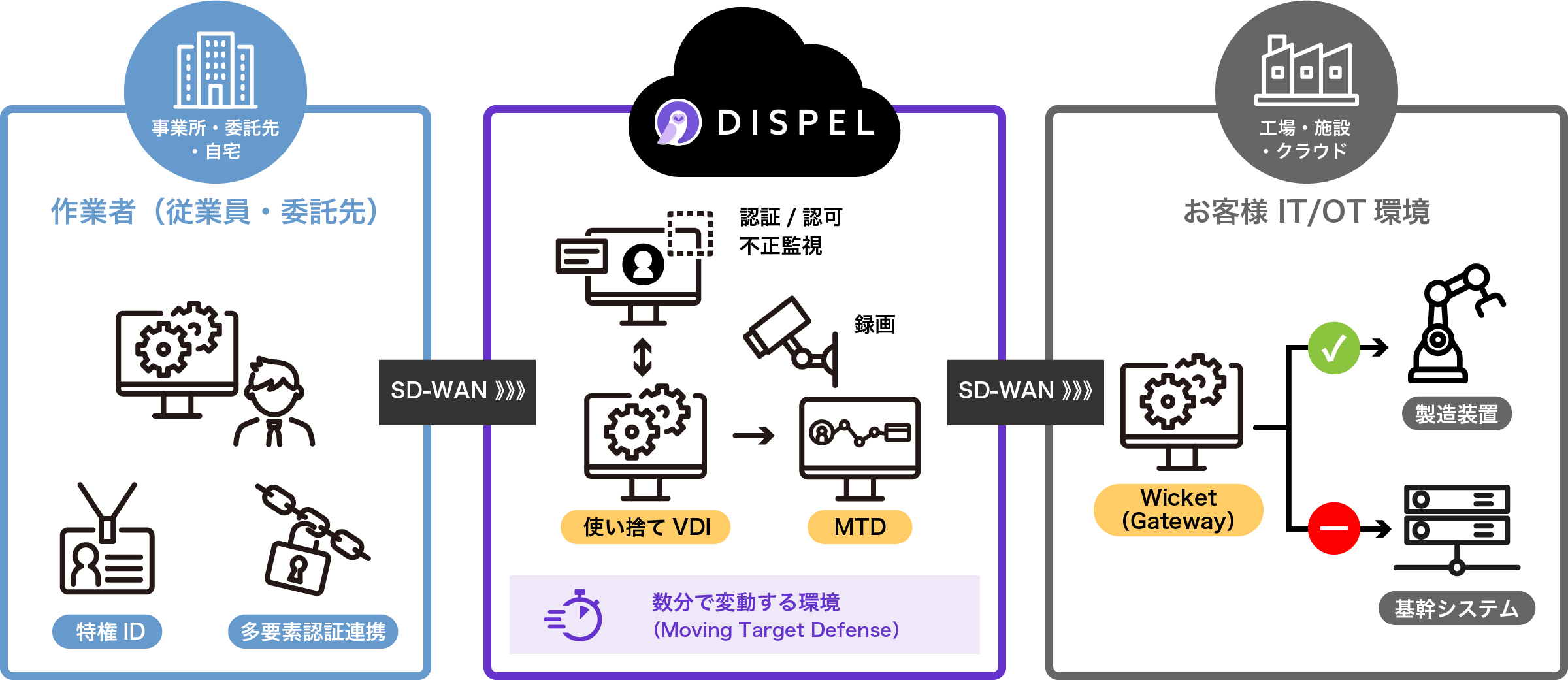 Dispelは、OT環境に特化した米国発のクラウド型セキュアリモートアクセスソリューションです。全65,535ポートに対応し、独自プロトコルが多いOT設備に最適化。IEC62443やNIST 800-53に準拠し、ゼロトラストアーキテクチャとMoving Target Defenseで多層防御を提供します。政府機関やフォーチュン500企業で2,000万時間以上の安全稼働実績があります。