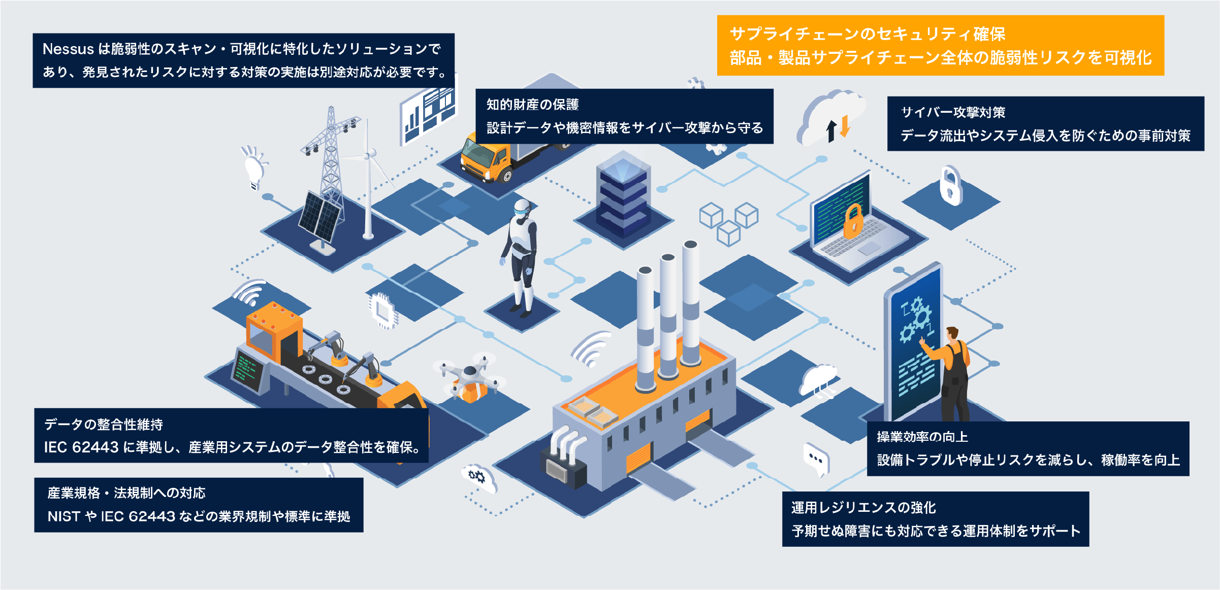 Nessusは、製造現場の生産ライン、そして産業用システムの脆弱性診断まで、見えないリスクを可視化し、レポート化することで、工場全体のセキュリティ品質を底上げします。